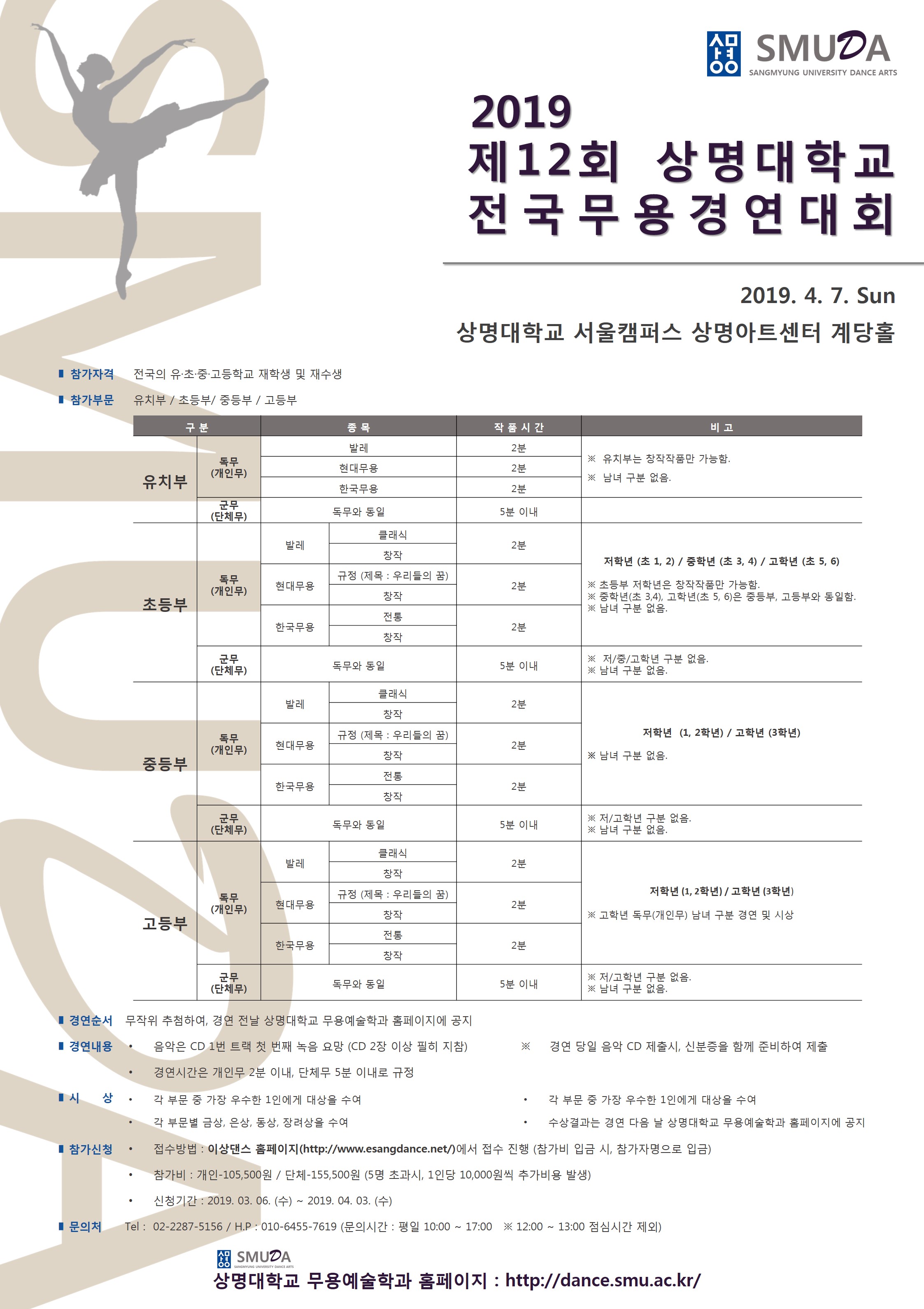 - [콩쿠르] 2019 제12회 상명대학교 전국무용경연대회 부문별 경연순서 공지