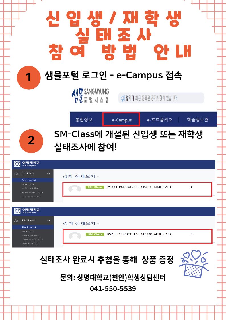 3. 조사 방법: 상명대학교 샘물 포털 e-Campus 로그인 - SM 클래스 - 2026학년도 신입생 실태조사(단과대학별)