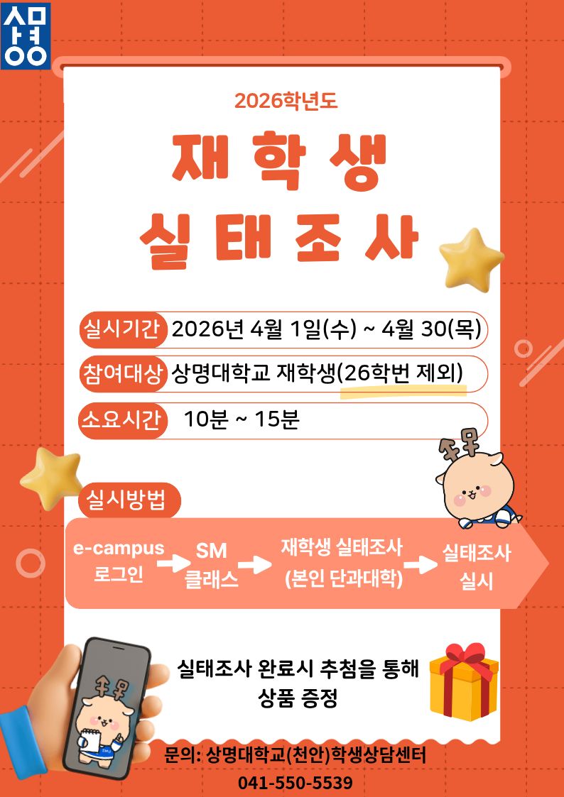 우리 상명대학교 학생상담센터에서는 재학생 여러분의 학습 경험 및 대학 생활 전반에 대한 의견을 수렴하기 위해 「재학생 실태조사」를 실시하고자 합니다.