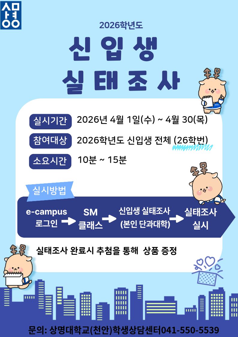 우리 상명대학교 학생상담센터에서는 여러분의 대학생활 적응과 교육 환경 개선을 위해 「신입생 실태조사」를 실시하고자 합니다.
